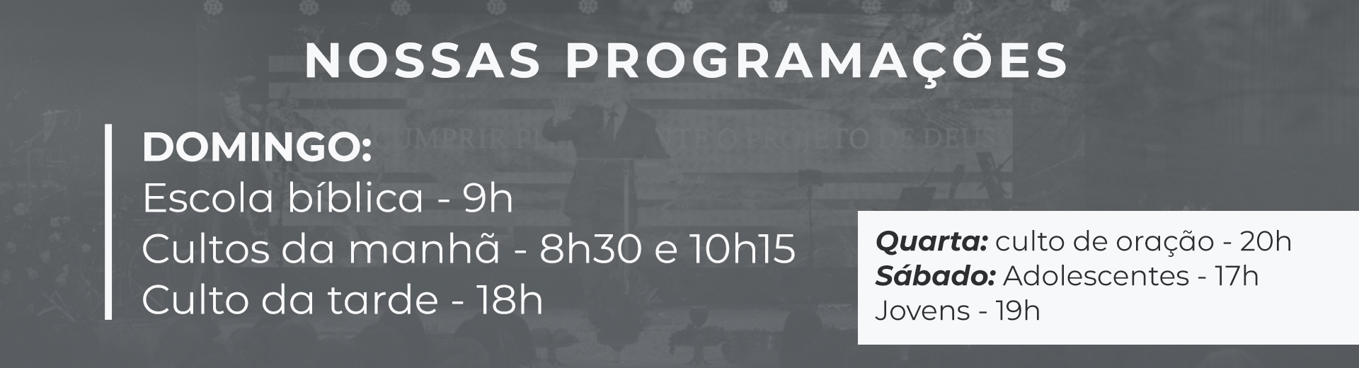 • Nossos Cultos: Domingo - 08h30, 10h15 e 18h/ Quarta - 20h